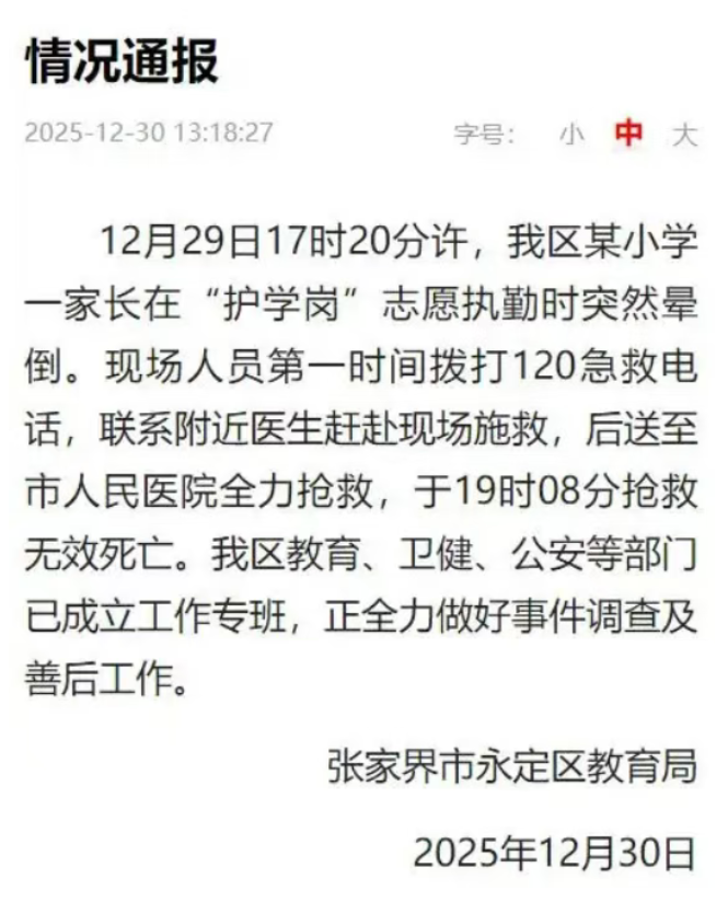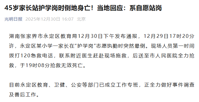 12月29日下午炒股杠杆配资,湖南张家界永定区一所小学门口,一名45岁的家长站在“护学岗”执勤时突然晕倒。现场急救、送医抢救,最终没能挽回生命。